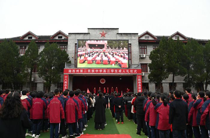 | 十八而志,大任始承;冲刺高考,逐梦未来。3月10日上午,我校2026届高三学生“十八而志 强国有我”成人礼仪式在学校田径运动场隆重举行。校党委书记谢彪,党委副书记、校长田庭椿,党委委员、纪委书记、副校长彭艳萍,党委委员、副校长鲁帮明,党委委员刘征,党委委员田际侦,党委委员田正敏等校领导出席活动,与全体高三师生及学生家长代表共同见证了这一庄严而温情的时刻。全体高二师生齐聚现场,为学长学姐加油助威。仪式由党委委员、纪委书记、副校长彭艳萍主持。 清晨的运动场上,红毯铺展,成人门与成功门巍然矗立。八点零八分,在热烈的掌声和祝福声中,高三学子们在谢彪书记的带领下,在家长的陪伴下,昂首阔步依次走过“成人门”,迈过“成功门”。这一步,跨越的是青涩与懵懂,迈向的是责任与担当;这一程,承载着父母的殷殷期盼、师长的谆谆嘱托,也预 示着学子们在即将到来的高考中旗开得胜、金榜题名。走过“成功门”后,全体师生肃然列队,静候庄严时刻。 大会在升国旗、奏唱国歌的仪式中正式拉开帷幕。全体师生肃立注目,面向国旗,高唱国歌,激荡起心中的爱国热情与青春壮志。 国旗飘扬,壮志在胸。校党委书记谢彪发表致辞。首先向同学们致以热烈的祝贺,并向辛勤耕耘的老师和家长表达了诚挚的敬意。他指出,成人礼不仅是一场仪式,更是一份嘱托、一份期许——从今天起,同学们将独自面对人生的风雨,也将邂逅无限的可能与美好,对全体高三学子提出三点期望:一要志存高远,做有理想、有担当的新时代青年;二要砥砺奋进,做有拼劲、有韧劲的追梦人;三要常怀感恩,做有温度、有情怀的暖心人。他强调,母校永远是学子们最坚强的后盾,无论走多远、飞多高,这里永远是温暖的港湾。最后他祝愿同学们以成年为笔,以奋斗为墨,书写精彩人生;愿笔锋所至,梦想开花;愿历尽千帆,归来仍是少年。谢书记的深情寄语,如春风拂面,如战鼓催征,深深烙印在每一位学子心中。 谆谆教诲犹在耳畔,庄重的授冠仪式随之而来。校领导们为各班学生代表郑重佩戴成人纪念章、颁发成人证书。全体高三同学也相互佩戴起属于自己的徽章,现场气氛庄重而热烈。一枚枚徽章,见证着成长的蜕变;一本本证书,承载着成年的责任与荣光。 十八而志,感恩先行。学子们在主持人的深情引导下,转身向朝夕相伴、倾心付出的老师、家人们深深鞠躬并相互拥抱,感谢他们的培育与守护之恩。温情的感恩致礼环节,让整个运动场涌动着浓浓暖意。 温情在感动中流淌,也在期待中延续。家长代表深情回望:昔日依偎在父母怀中的孩童,如今已身姿挺拔、意气风发;她殷殷嘱托:成年不仅是年龄的增长,更是心智的成熟,愿孩子们正直、善良、勇敢、坚定。针对即将到来的高考,她寄语学子放平心态全力以赴,所有的努力终会开花结果。真挚的话语令在场师生与家长深受触动。未能到场的家长们也通过提前录制的祝福视频,跨越山海为孩子们送来了惊喜与鼓励,温暖了每一位学子的心。 家人的祝福温暖心田,成人的誓言则响彻云霄。在成人宣誓环节,全体高三同学在领誓人胡诗雨同学的带领下,高举右拳,许下对国家、对社会、对家庭、对自己的庄严承诺。“铭记责任,超越自我,为未来谱写华章!”的铮铮誓言在校园上空回荡,展现了新时代青年的热血与担当。 誓言铿锵,师恩难忘。教师代表李永超以王国维《人间词话》三重境界为脉络,为学子指明高考冲刺的精神坐标。她以“昨夜西风凋碧树,独上高楼,望尽天涯路”喻立志之境,以“衣带渐宽终不悔,为伊消得人憔悴”释坚守之境,以“众里寻他千百度,蓦然回首,那人却在,灯火阑珊处”昭圆梦之境,寄语学子定目标、肯吃苦、守初心,奔赴六月战场,赢得青春荣光。 李老师的教诲余音未落,大屏幕上又播放起高三全体教师及历届优秀学长学姐精心录制的祝福视频。各学科组老师们或深情寄语、或幽默鼓励,用最熟悉的声音为学子们加油打气;远在各大高校的学长学姐们也通过镜头送上“高考必胜”的诚挚祝愿。熟悉的面孔、温暖的话语、跨越时空的鼓励,让在场学子备受感动与鼓舞。 师长的嘱托与学长的祝福,化作了学子们胸中的万丈豪情。学生代表余晶同学上台发言,“少年自有凌云志,当乘长风破万浪”,她的话语铿锵有力,喊出了全体学子不负韶华、不负时代,以青春之名赴万丈理想的决心与豪情。随后的班级宣誓环节,各班依次呐喊出精心准备的冲刺口号,声浪此起彼伏,尽显少年锋芒与必胜决心。 豪情满怀之际,大会迎来了最激动人心的时刻。在“梦想启航·传递幸运球”环节,承载着祝福与好运的幸运球在队伍中传递,现场气氛热烈高涨。全场师生齐声高喊“高三加油、高考必胜!州二民中加油、州二民中必胜!”的嘹亮口号,将大会气氛推向了顶点。 最后,在主持人的宣布声中,我校2026届高三学生“十八而志 强国有我”成人礼仪式在热烈而有序的氛围中圆满落幕。全体高三学子带着师长的嘱托、父母的期盼和自己的誓言,意气风发地迈向人生新的征程。 此次成人礼仪式,不仅是一场青春的庆典,更是一次精神的洗礼和奋斗的动员。它激励着湘西州第二民族中学2026届全体高三学子,以十八岁成人为新起点,胸怀壮志、肩负使命,在接下来的高考冲刺中奋力拼搏,书写无愧于时代、无愧于青春的绚丽华章。 校长田庭